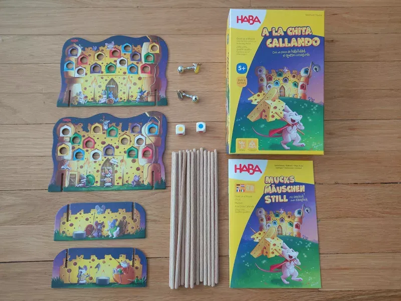 Sitio web del editor: «Morris Mouse se cuela de puntillas en el castillo de queso para robar un poco de queso real. Pero cuidado: ¡las campanas de alarma reales no deben sonar! Intenta deslizar con cuidado tus palos de madera por los agujeros del castillo de queso sin tocarlo. ¡Los demás jugadores, mientras tanto, tienen que estar en silencio como ratones! Si un jugador se atreve demasiado, las campanas de alarma sonarán inmediatamente y su turno terminará. Un juego de habilidad silencioso para 3 o 4 jugadores tan silencioso como ratones de entre 5 y 99 años».