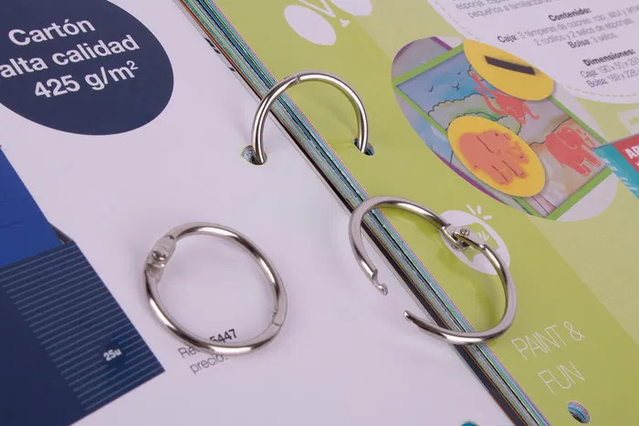 Anillas metálicas articuladas de Ø 25 mm. Acabado niquelado para una mayor duración y resistencia. Ideales para encuadernación de hojas sueltas, archivo de notas, trabajos de scrapbooking, álbumes, llaveros, etc. Cada caja contiene 20 anillas.