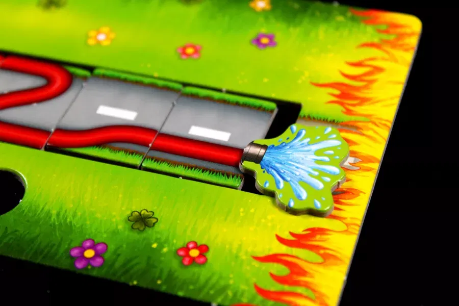 4 tableros (compuestos de dos partes), 60 fichas de manguera, 5 piezas de salida, 9 medallas,1 ficha «agua va», 4 bocas de incendio de madera, 1 instrucciones del juego.