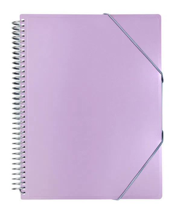 Carpeta con espiral de plástico indeformable y cierre con goma redonda con terminal. Colores metalizados. Con fundas de polipropileno piel naranja con refuerzo tamaño A4. Contiene sobre de polipropileno con solapa y velcro de cierre ideal para guardar pequeños objetos como bolígrafos, tarjetas de transporte, monedas, etc.