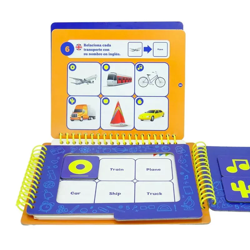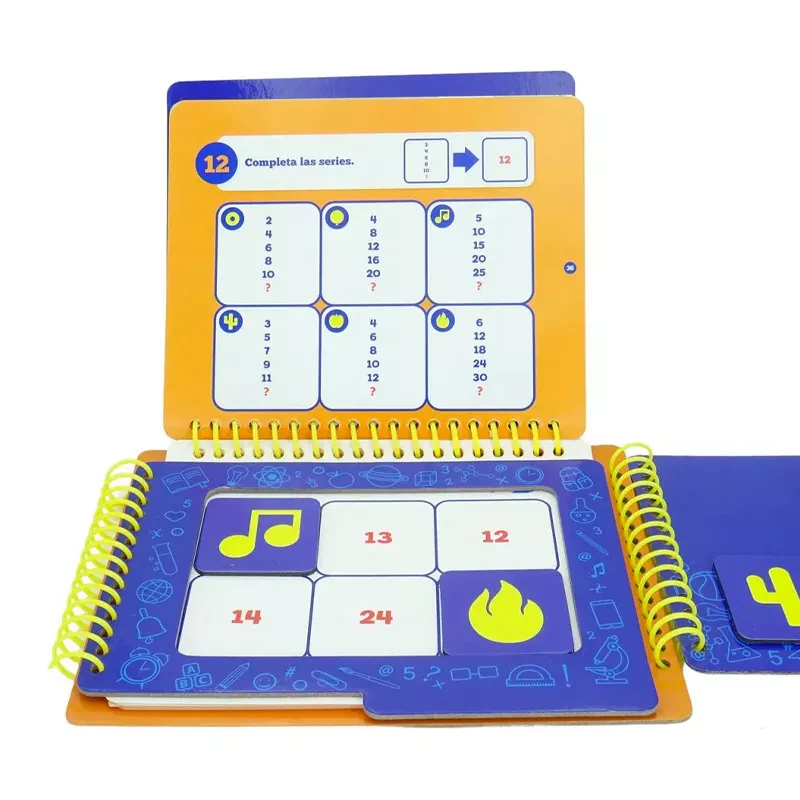 - Coloca las fichas magnéticas en el sitio que le corresponda, cierra el libro con el panel de la espiral derecha y comprueba tu mismo si el dibujo que aparece al dorso de las fichas corresponde con el del reto escogido.