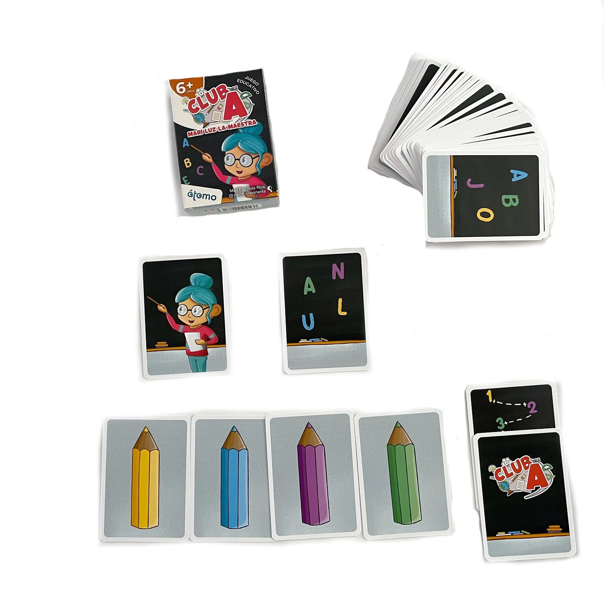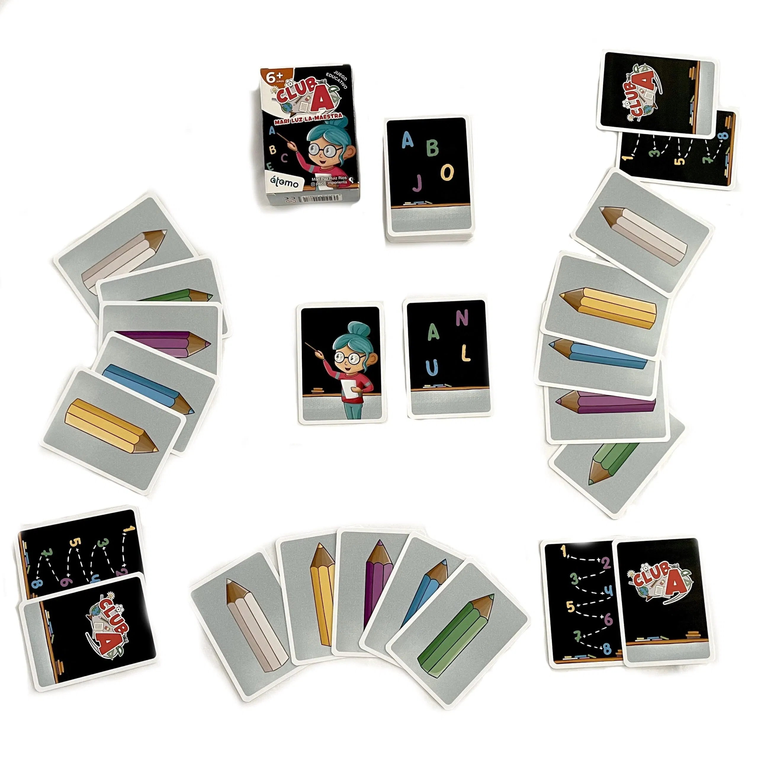 Los juegos de club A, consisten únicamente en una económica y transportable baraja de 50 cartas, con ilustraciones pensadas para que los niños disfruten. Su fácil mecánica, facilita que los niños puedan jugar en solitario o en grupos de cuatro.