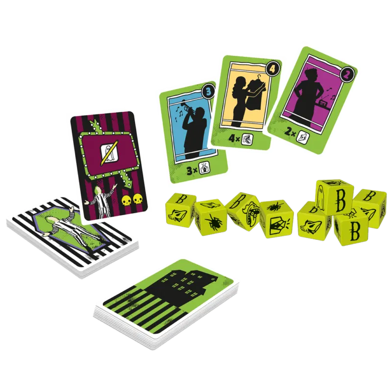 En tu turno, intentas asustar a los vivos y explotar sus miedos tirando los dados. Tu objetivo es conseguir tantos puntos como sea posible para ahuyentar a los vivos antes de que lo hagan los demás… o Beetlejuice. Cada persona viva solo puede ser ahuyentada por una determinada combinación de fenómenos fantasmales. Pero no tientes demasiado al destino o se vengará. Porque si tus dados muestran tres o más símbolos de Beetlejuice, lo llamarás para que salga de su ataúd. Si esto sucede con demasiada frecuencia, todos perdemos juntos y Beetlejuice se lleva la dulce victoria.