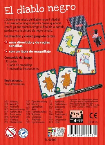 ¿Quién tiene miedo del diablo negro? íNadie! Ningún jugador quiere quedarse con él, ya que a quien lo tenga en su mano al final se le pondrá negra la nariz y perderá el juego. Duración de la partida: 10 minutos