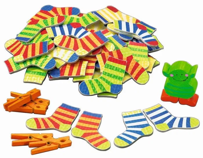1 monstruo, 48 calcetines (24 pares), 13 pinzas de la ropa, instrucciones de juego.