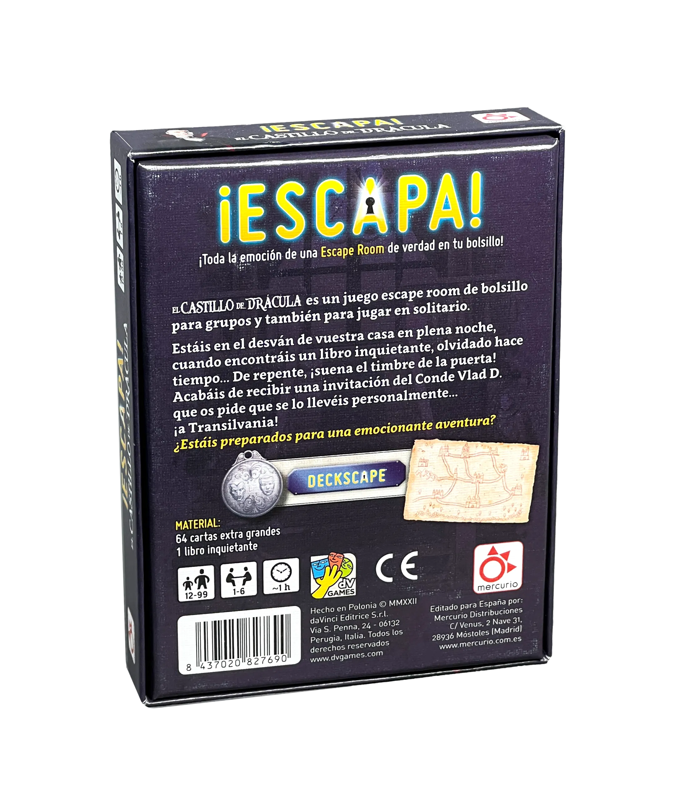 El castillo de Drácula es un juego escape room de bolsillo para grupos y también para jugar en solitario.Estáis en el desván de vuestra casa en plena noche, cuando encontráis un libro inquietante, olvidado hace tiempo… De repente, ¡suena el timbre de la puerta! Acabáis de recibir una invitación del Conde Vlad D. que os pide que se lo llevéis personalmente… ¡a Transilvania!