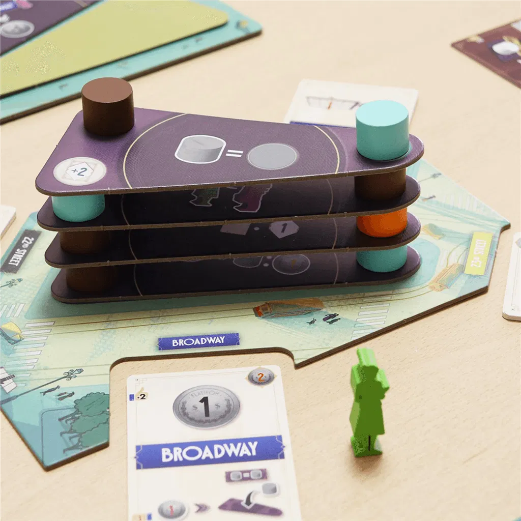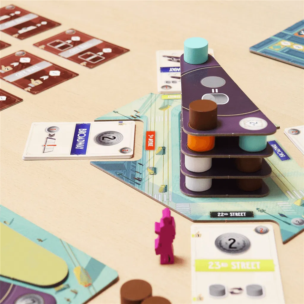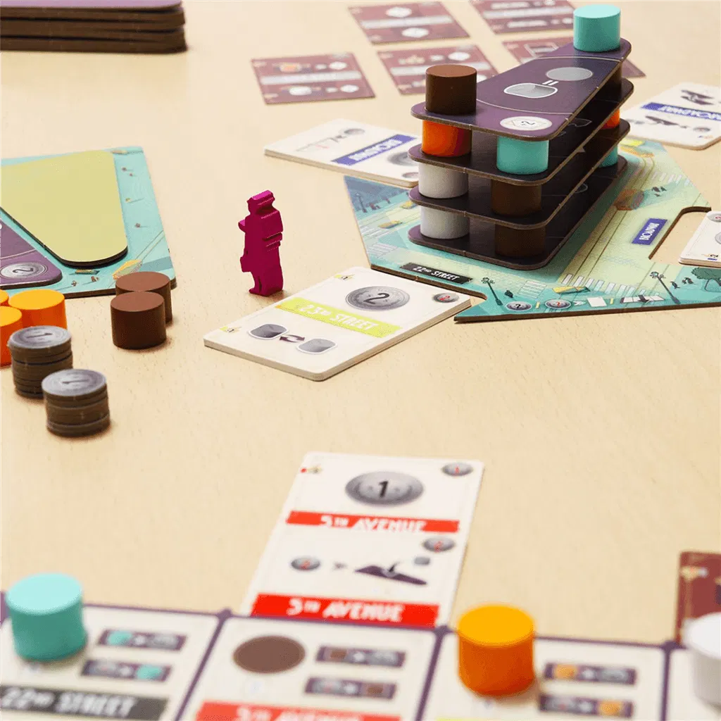 32 cartas de calle, 10 cartas de decreto del City Hall, 1 tablero de puntuación, 1 tablero del City Hall, 15 plantas, 1 tejado, 9 cartas de Daniel Burnham para el modo en solitario, 4 tableros personales a doble cara, 1 tablero de Manhattan, 26 monedas, 14 fichas de periódico, 4 fichas de reputación, 1 repartidor de periódicos, 1 contador de puntos, 28 pilares y 2 arquitectos.