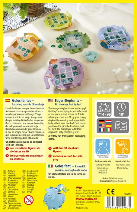 Los elefantes no pueden soportar más el hambre que tienen. ¿O quizás es que son muy golosos y quieren comerse todo que se les pone por delante? El objetivo de este juego es el primero/a en lograr llenar la panza de su elefante de hojas, para ello se requiere capacidad de observación y lógica.