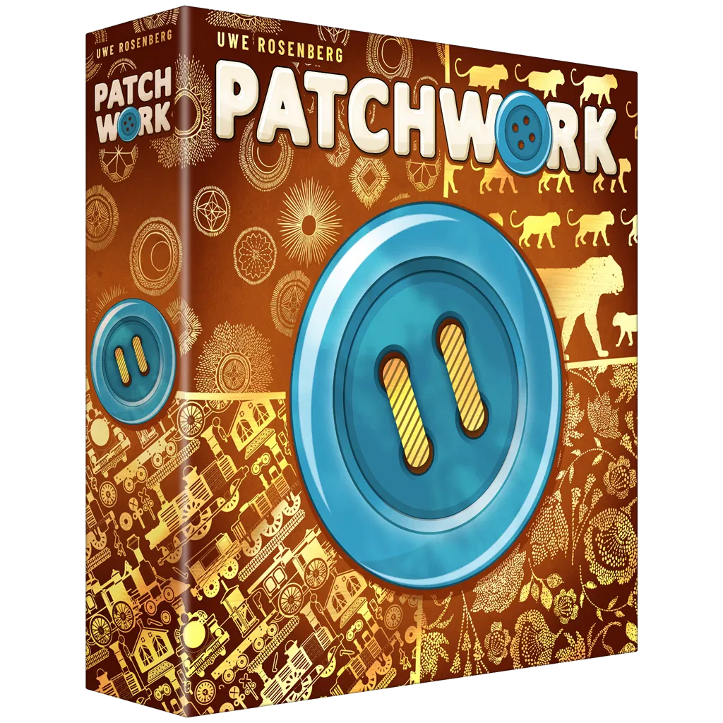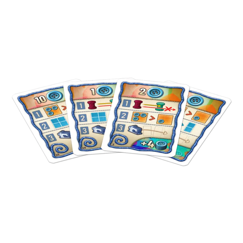 1 tablero de Tiempo, 2 tableros de Colcha, 2 contadores de Tiempo, 1 peón Neutral, 33 Parches, 5 Parches especiales. 1 pieza Especial, 50 Botones, 24 cartas de Automata y 2 reglamentos.