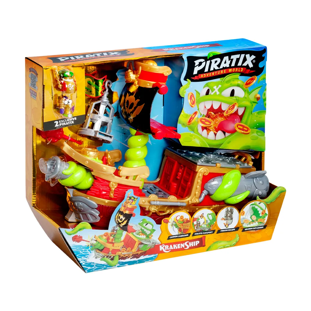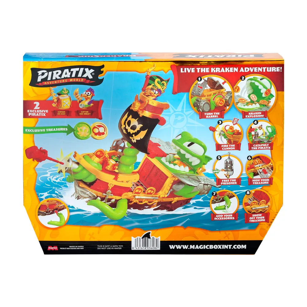 ¡En el barco del Kraken podrás vivir mil aventuras! Utiliza el tesoro para apuntar y disparar el cañón, abrir la prisión para liberar los Piratix atrapados y “despertar” al Kraken, que aparecerá en la parte posterior lanzando por los aires todo el tesoro que haya dentro de su boca. Y es que entre sus mandíbulas es donde encontrarás el tesoro exclusivo del Kraken, ¡el que tantos y tantos han buscado sin éxito, ahora es tuyo! Aprovecha y utiliza la catapulta para lanzar a tus rivales Piratix en sus fauces, ¡ahora el Kraken y su temible tripulación, el Capitán Big Blue y su fiel compañero Bad Horsey, son tus aliados! Puedes subir a bordo tu colección Piratix e insertar las monedas en los diferentes soportes que encontrarás por todo el barco, incluidos en la parte superior del nido de cuervos.