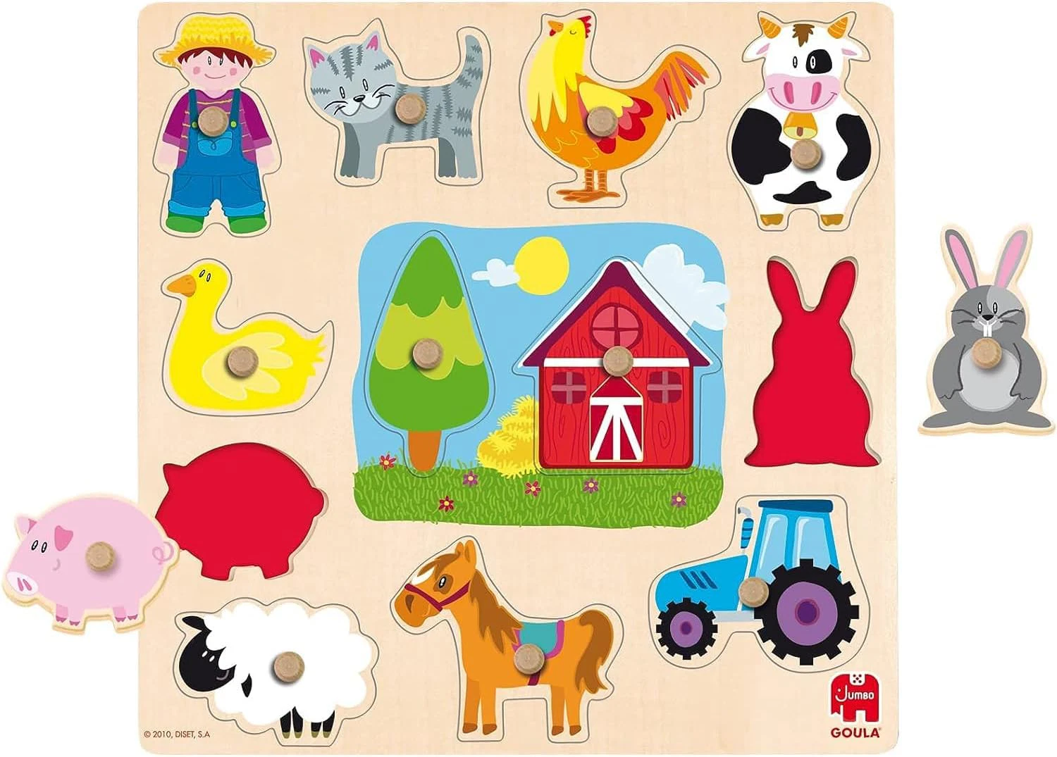 Habilidades que desarrolla: aprendizaje de diferentes animales, personajes y objetos de una granja, asocia las piezas por su silueta, desarrolla la coordinación manual ojo/mano, la percepción visual y la motricidad fina