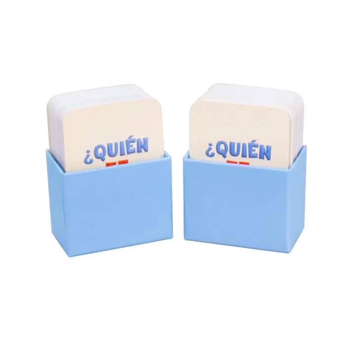 200 cartas de juego, 12 tarjetas de respuesta, 12 rotuladores, 1 tarjeta de puntuación y reglas de juego.