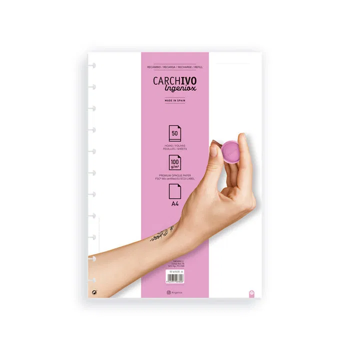 Recambio para cuaderno Ingeniox con 50 hojas de papel de 100gr, extraibles y compatibles con cuaderno A4 y A5. Tamaño A4.