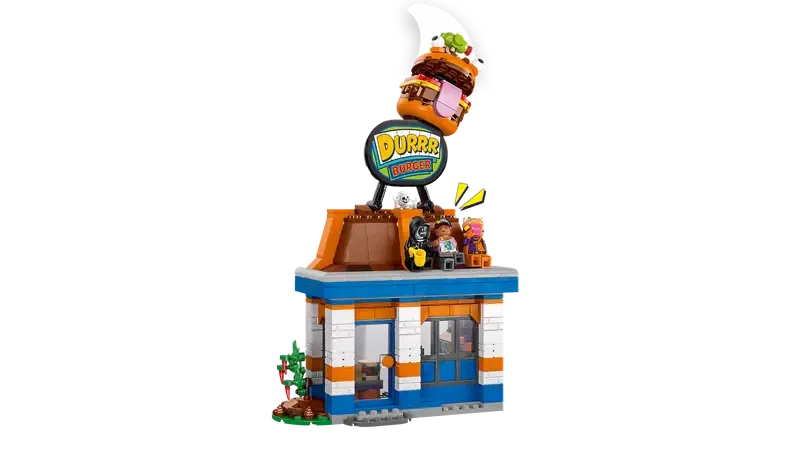 Los jugadores se lo pasarán genial dando forma al modelo del restaurante Hamburrrguesa (modular para animar a personalizarlo). Luego, en el interior, descubrirán un puesto de salsas, una máquina de refrescos y una caja registradora; en el exterior, encontrarán una terraza con una taza y un huevo frito. Tiene un ático desmontable con una figura de una araña y suficiente espacio para otros accesorios, como una pala y dinamita. Las minifiguras de Bombardera playera, Caudillo cárnico, Parco y un esqueleto darán vida a la acción.