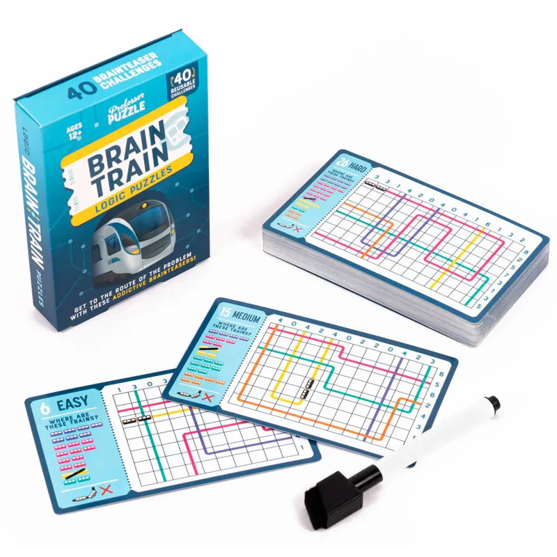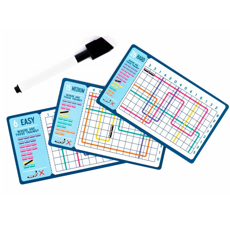 Con 40 desafíos perfectos para viajar que van aumentando de dificultad, utiliza la cuadrícula para determinar las ubicaciones de los trenes. Una vez los hayas resuelto puedes borrarlos y volver a usarlos.