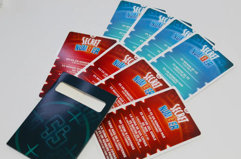 CONTENIDO: 35 cartas de número (en 2 niveles: básico y avanzado), 50 cartas de reto, 1 sobre para pistas y reglamento