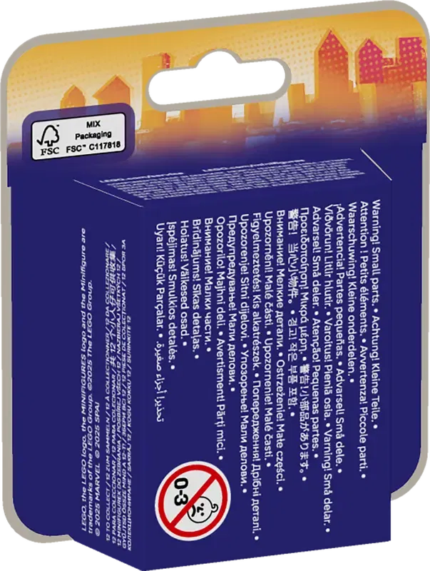 Las 12 minifiguras de juguete LEGO Marvel vienen cada una en una caja sorpresa con al menos 1 accesorio y un folleto de información para coleccionistas.
