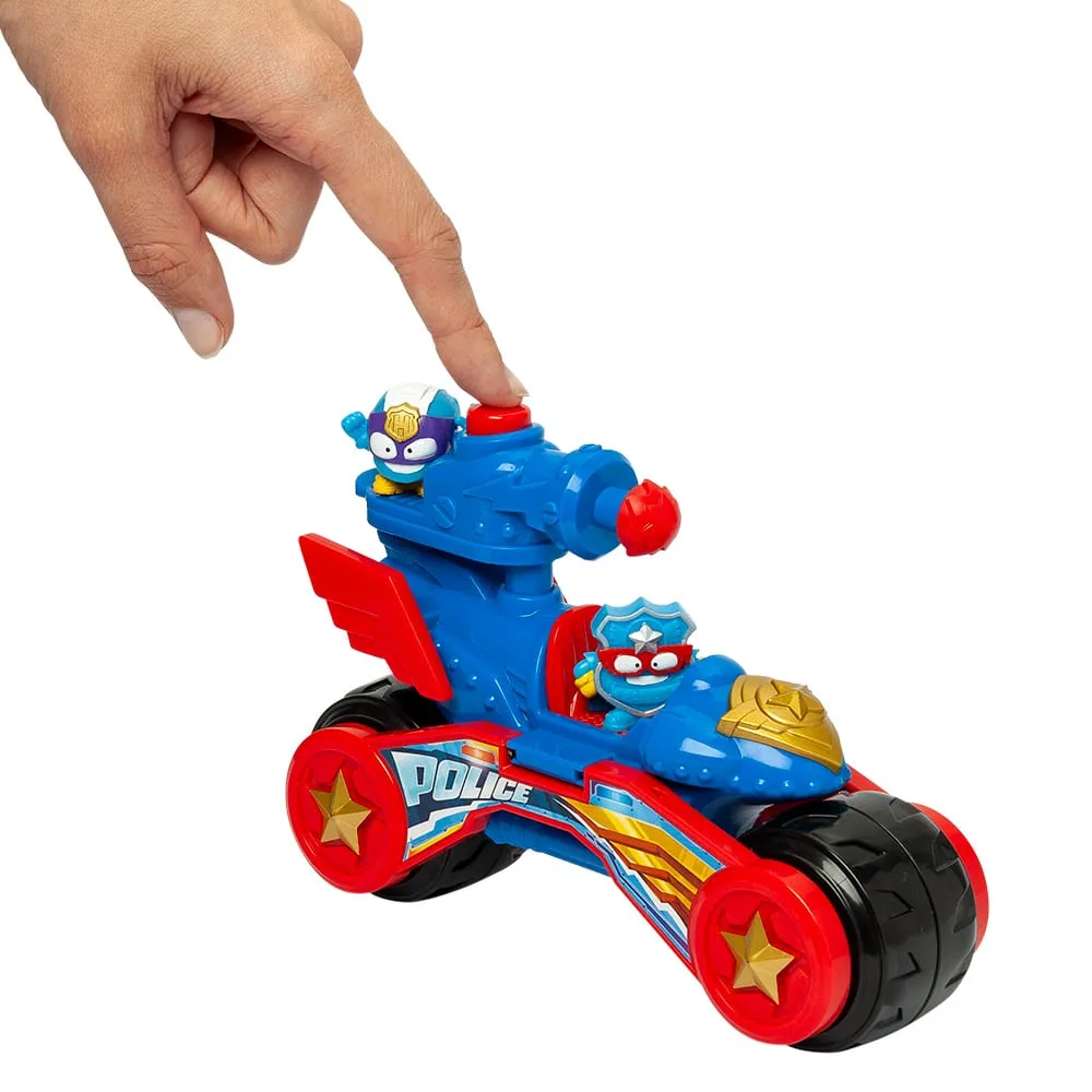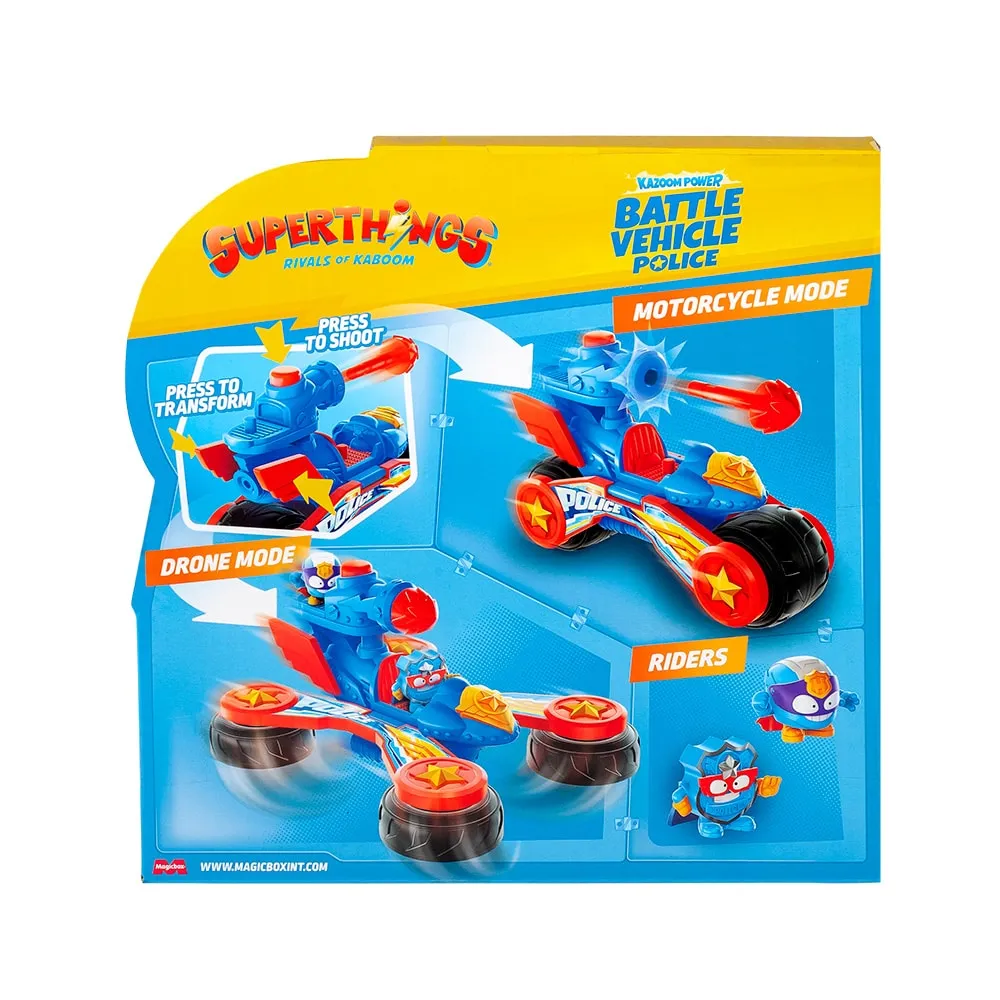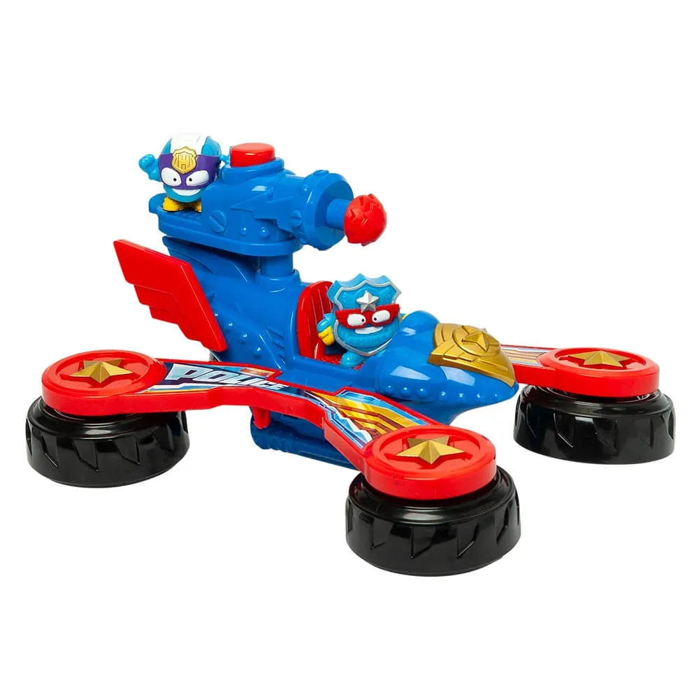 Ayuda a los héroes con el Vehículo de Batalla de la Policía. Recorre las calles de Kaboom City en su modo moto y dispara el cañón para abrirte paso a tiros o detener a los villanos. Y cuando necesites un impulso de velocidad… ¡transfórmalo en un dron para patrullar desde el aire! El Vehículo de Batalla de la Policía incluye dos Supercosas exclusivas capaces de controlar este supervehículo. ¡Colócalos en los dos asientos del vehículo y a la batalla!