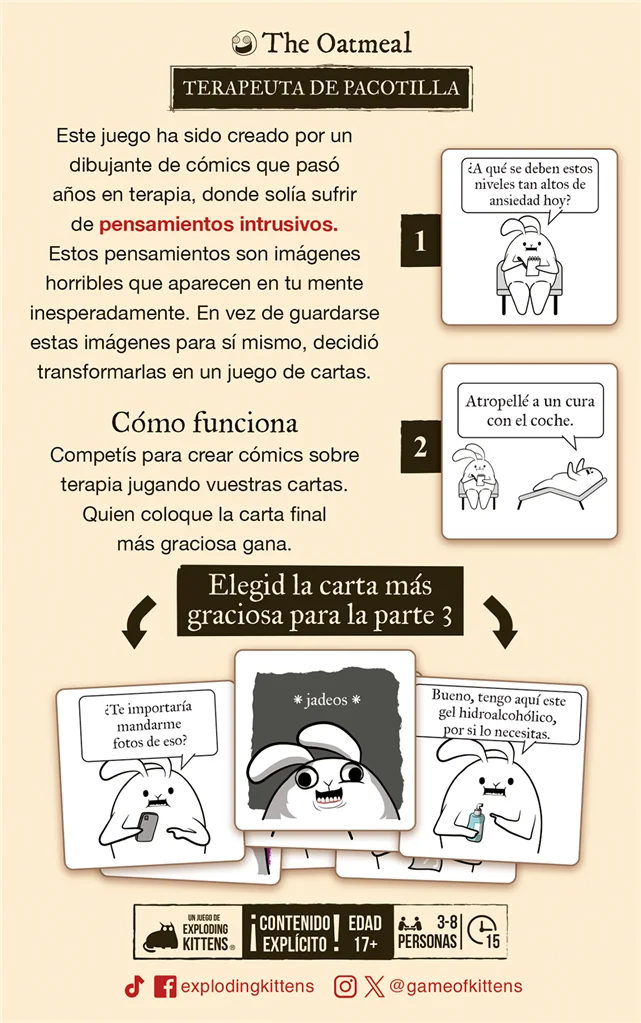 Es un juego que consiste en crear cómics de 3 escenas, empezando por una pregunta, seguida de una respuesta y, finalmente, un tratamiento psicológico. Ganáis 1 punto si vuestro tratamiento es el elegido como la mejor opción para terminar el cómic.